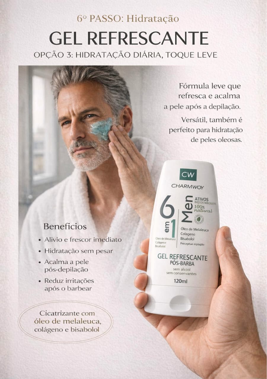 CONTÉM ATIVOS 100% NATURAIS QUE AJUDAM A DIMINUIR A IRRITAÇÃO COMUM DO BARBEAR OU DEPILAR. O USO DIÁRIO DESTE PRODUTO TRAZ SEIS BENEFÍCIOS DE UMA SÓ VEZ: REFRESCANCIA PROLONGADA QUE ACALMA A PELE, HIDRATAÇÃO INTENSIVA, CONTROLA A OLEOSIDADE, BACTERICIDA E CICATRIZANTE, PREVINE O ENVELHECIMENTO E RECUPERA A PELE APÓS O BARBEAR. USE O GEL REFRESCANTE PÓS BARBA E TENHA UM ROSTO SEMPRE MACIO E HIDRATADO.